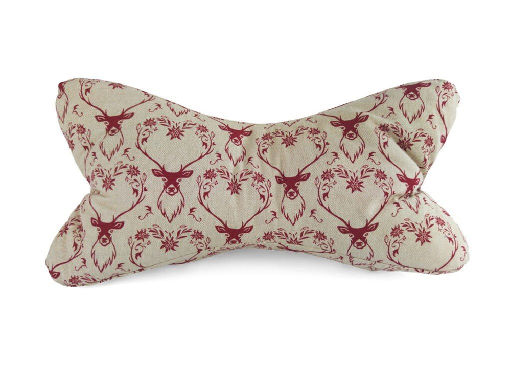 Der „Leseknochen – Hirschliebe, rot“ verbindet Gemütlichkeit mit alpiner Ästhetik. Das elegante Design zeigt Hirsche, deren Geweih ein Herz aus Edelweiß formt – eine charmante Hommage an die Berglandschaften.
