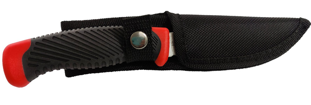 Der Griff aus Polypropylen mit rutschfester Manschette aus TPR leuchtet in auffälligem Rot, sodass das Messer leicht gereinigt und auch im Dunkeln schnell wiedergefunden wird. Im Lieferumfang ist eine Nylon-Messerscheide mit Druckknopfsicherung enthalten. Das geringe Gewicht ermöglicht ermüdungsfreies Arbeiten.