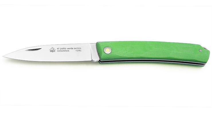 Das Modell PUMA IP El Pato Verde ist ein kleines, elegantes Klappmesser ohne Verriegelung (Slip Joint) für den täglichen Gebrauch. Es verfügt über eine 75 mm lange Klinge aus robustem 1.4116 Stahl und Griffschalen aus grünem Micarta mit facettierter Oberfläche, die für sicheren Halt sorgt.