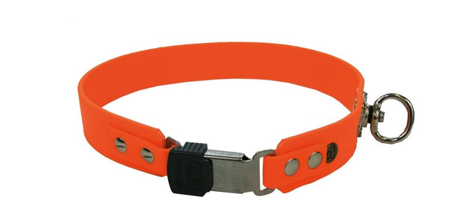 Die signalorange Schweißhalsung mit patentiertem Clicklock ist robust, rostfrei und schnell zu öffnen und kann genau auf die Größe des Hundes gekürzt werden: